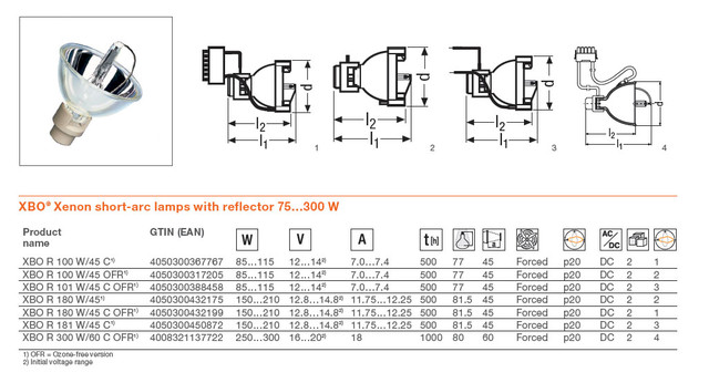 Лампа для відеопроцесора ксенонова короткодуговая з відбивачем OSRAM XBO R 100W/45 C
